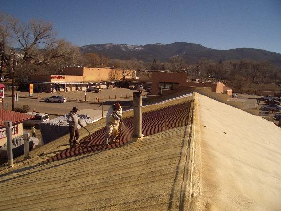 Покрівлі з бетонних плит або дахи, покриті руберойдом, герметизують і утеплюють шляхом напилення полімеру. У процесі роботи використовується спеціальне обладнання. З його допомогою на поверхню покрівлі наноситься безшовний шар розпиленням ППУ. Піна заповнює порожнечі, утворюючи монолітне покриття. Висока адгезія дає можливість утеплювачу рівномірно покривати поверхні зі складною геометрією.